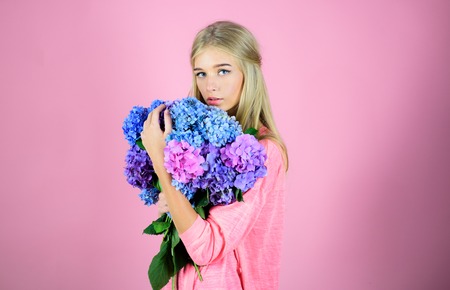 Fashion portrait of woman. Healthy hair and skin. Summer beauty. Spring woman with hydrangea flowers. Makeup cosmetics and skincare. girl with summer makeup. Spring fashion photo.