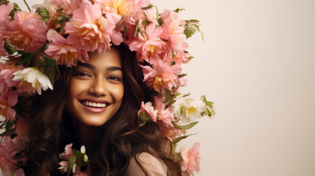 Brunette asian model holding beige chrysanthemums on abstract brown background, banner