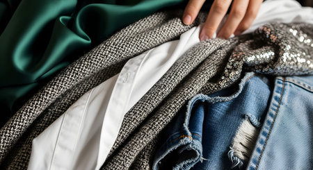 A close-up view of a hand sorting through a pile of diverse clothing fabrics, including blue denim, green satin, and silver sequins. The image highlights texture, fashion choices, wardrobe organization, or textile variety.