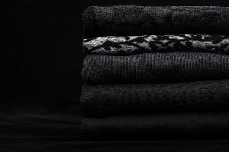 Black clothes and one gray with ornament in a pile on black background.