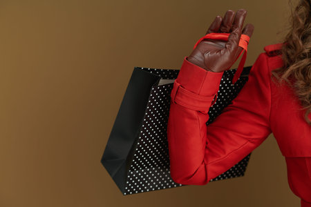 Hello autumn. happy middle aged housewife in red coat and black beret with leather gloves and yellow autumn maple leaves using smartphone applications isolated on bronze background.