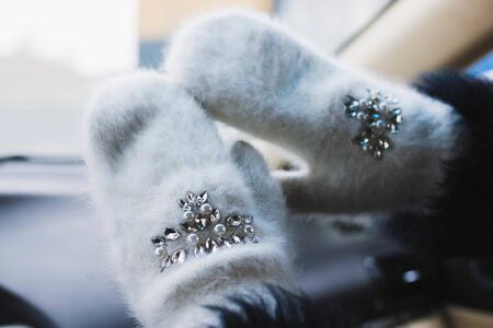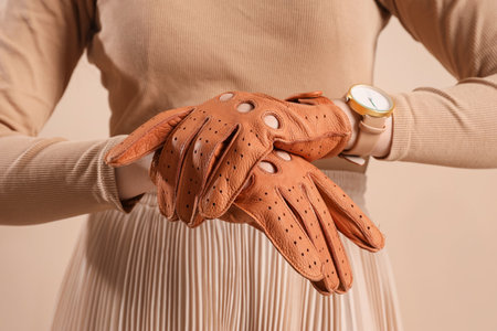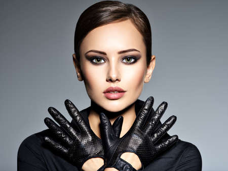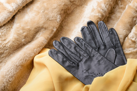 Beautiful young woman in leather gloves and sheepskin on light background, closeup
