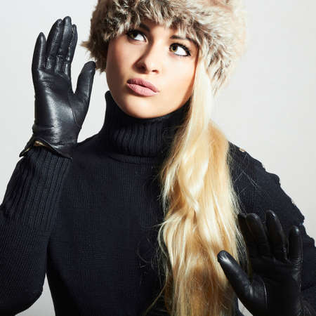 Beautiful Fashion Girl in Fur Hat. Beauty Blond Woman in Leather Gloves. Black sweater. Winter Fashion. Light Background
