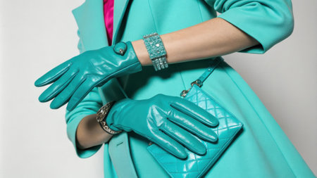 A fashioninspired shot highlights hands in neon turquoise gloves elegantly posed. The glimmering reflections intertwine with the gloves bold color creating a strikingly modern.