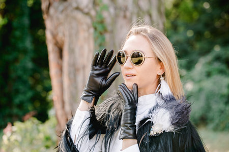 Beautiful stylish blonde in leather gloves and a fur jacket