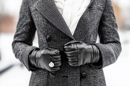 A woman in a gray coat and black gloves shows off a sparkling ring against a snowy winter scene.