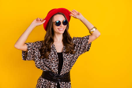 Portrait of pretty chic luxury cheerful girl posing touching cap summertime isolated over bright yellow color background