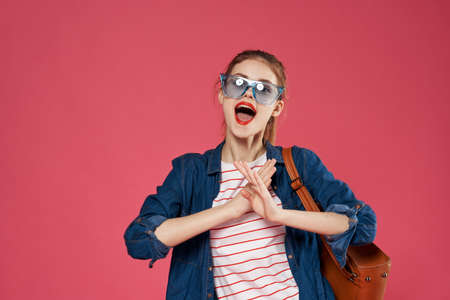 Pretty woman fashion lifestyle clothing studio pink background backpack