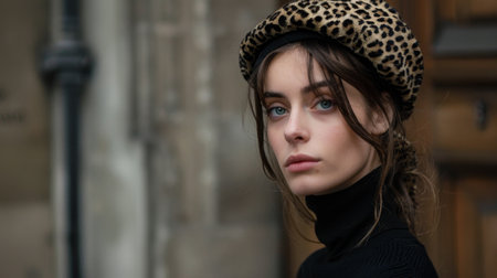 Outdoor portrait of young elegant fashionable woman wearing trendy hat walking in street of European city.