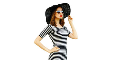 Portrait of beautiful woman model wearing black round summer hat, striped dress isolated on white background