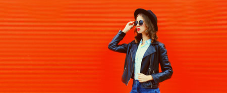 Portrait of stylish woman model posing wearing black rock style leather jacket, round hat on red background