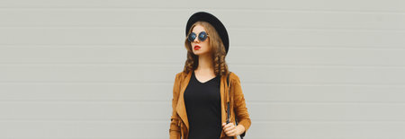 Beautiful stylish young woman posing with handbag looking away in black hat, jacket, glasses on city street on gray background