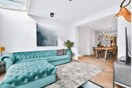 Luxury living room with blue sofa, coffee table and plant