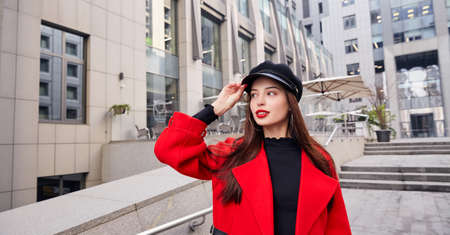 Admirable ravishing dreamy girl in earrings rings, in red autumn coat and black golf holds her black kepi by hand and looks at side. Lady stands near building on the steps.
