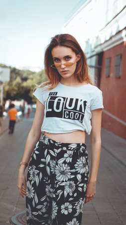 Fashion portrait stylish pretty woman in sunglasses posing in the city, street fashion. You look cool on white t-shirt