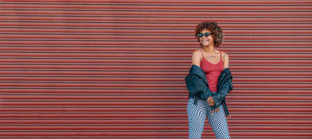 Portrait of stylish african young woman with dreadlocks wearing sunglasses, brown jacket on red background, blank copy space for advertising text