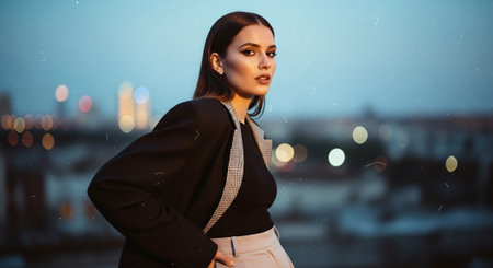 A fashionable woman posing outdoors during twilight, wearing a stylish outfit with a blazer and high-waisted pants, city lights in the background