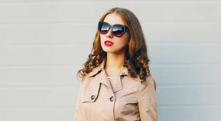 Close up portrait of attractive woman wearing a coat, sunglasses in the city over gray background