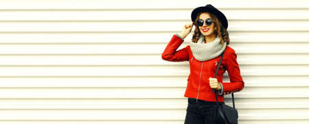 Stylish young girl in fashionable clothes and black hat smiling to the camera, posing on the city street. Real people lifestyle.