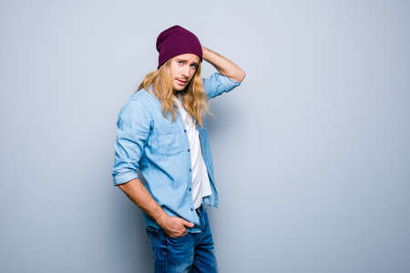Handsome young guy with stubble, long blonde hair, is dressed in denim jeans casual outfit and purple hat, he is holding his hand in a pocket and touching his head, isolated on grey background