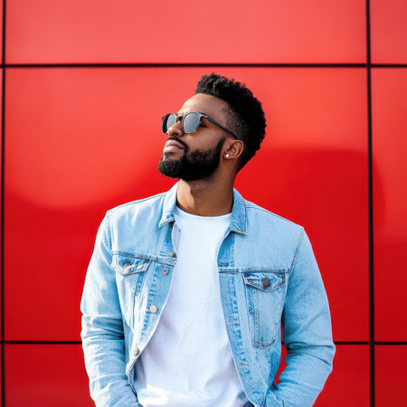 A man stands confidently wearing sunglasses and a denim jacket in front of a striking red background enjoying the moment.