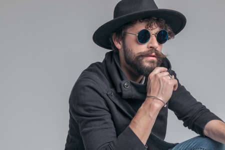 thoughtful unshaved young model wearing beige jacket and sunglasses, looking to side, holding hand to chin and thinking, holding elbows on knees and crouching on grey background