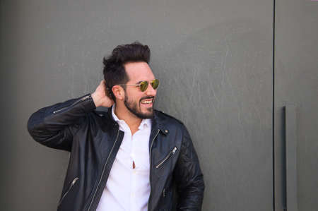 Fashion young handsome man with fashionable sunglasses on gray background