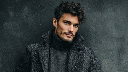 A man stands confidently, wearing a wool coat and turtleneck. He poses against a clean background, creating a strong fashion presence. The scene captures urban style and modern appeal.