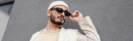 Low angle view of fashionable gay man in hat touching sunglasses near building on urban street, banner