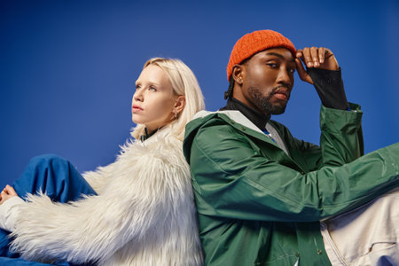 interracial models in trendy winter outfits posing together on blue backdrop, diversity and style