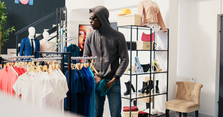 African american shoplifter trying stole fashionable clothes being caught by bodyguard in clothing store. Asian security guard asking robber to return stylish merchandise or will call the police