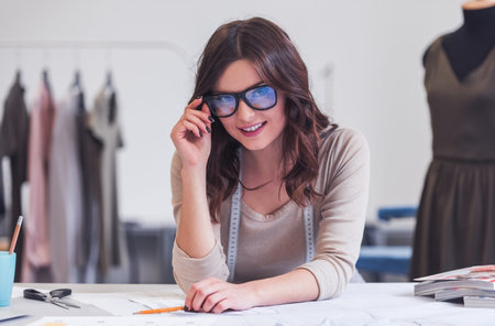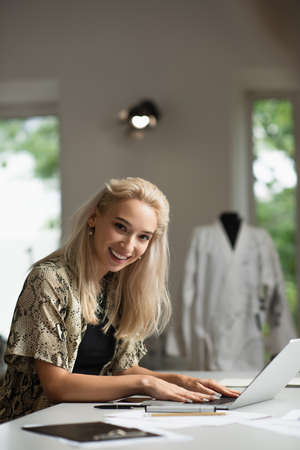Beautiful fashion designer is looking at camera and smiling while working in her office