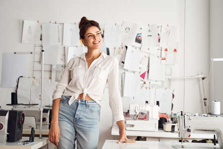 Portrait of young adult fashion designer as owner entrepreneur at her atelier studio. Using for entrepreneur startup concept.
