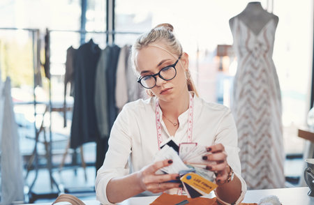 Young contemporary fashion designer choosing colors and textile for new collection by table