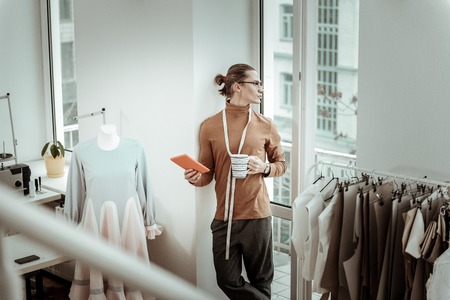 Coffee break. Hard-working creative famous fashion designer having little coffee break while working hard