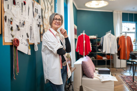 Thoughtful mature lady tailor holds papers in light sewing workshop