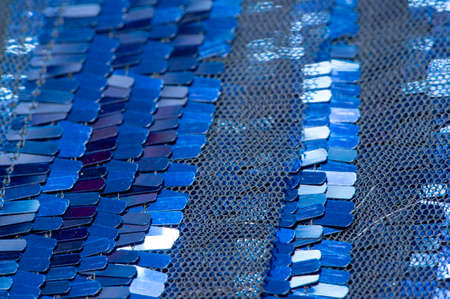 Sequins in blue. Ribbon for fabric decoration. Background texture, sunrise. Smooth slope of rows of round sapphire sequins on a fine mesh of fabric.