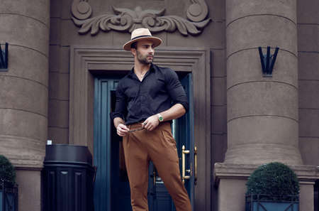 Portrait of a beautiful brutal tanned muscular hipster man in black shirt, hat and sunglasses posing in the streets of the European city