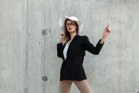 Fashion young girl in glasses in stylish business black-white clothes and beautiful straw hat stand and dancing near gray wall outdoors. beauty lady. Elegant summer look.