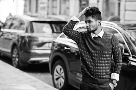 Portrait of young stylish indian man model pose in street against suv car.