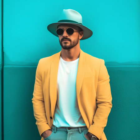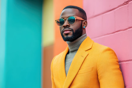 A stylish man with a beard stands confidently by a vibrant wall wearing stylish sunglasses and a sleek turtleneck.