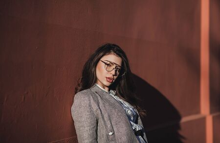 Portrait of beautiful young woman wearing jacket, sunglasses, round hat on brown wall studio background