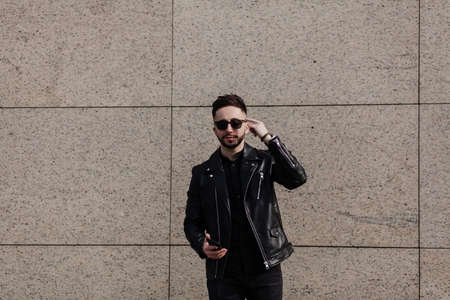 Handsome stylish man mobile phone. Modern technology. Living online life. Social networks. Modern life online communication. Guy with smartphone urban space background. Copy space