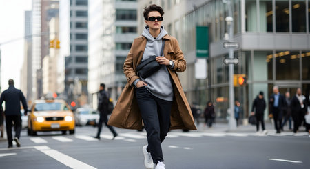 A stylish person wearing a trench coat, hoodie, and sunglasses walks confidently across a busy city street with a yellow taxi behind them. The image captures modern urban street fashion and the energetic vibe of a metropolitan lifestyle.