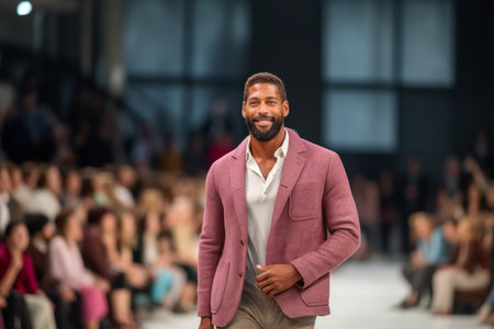 A stylish model showcases hip hop fashion on runway, exuding confidence