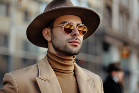 Handsome young man in sunglasses and beige coat on the street