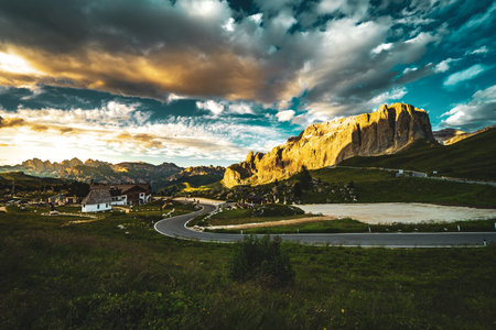 Passo Gardena in Dolomites at sunset, Italy