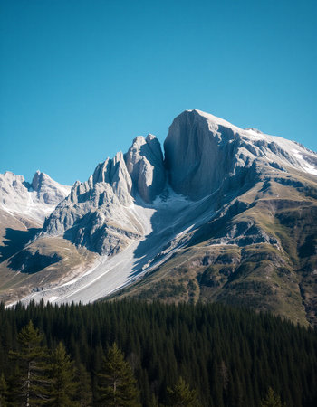 breathtaking landscape shot of a beautiful white mountain with evergreen tree forest at its base. Perfect for a wallpaper or a background.