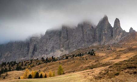 Beautiful foggy mountain landscape of the picturesque Dolomites at Passo Sella area in South Tyrol in Italy.