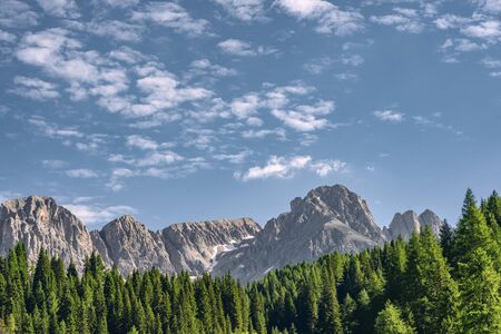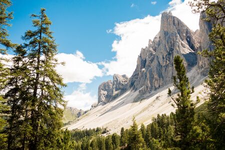 Left side view from forest of the Geisler or Odle mountains in the Dolomites, Italy